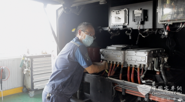 从前的油车检修大部分是围绕车身硬件进行检修,现在面对新能源公交,还需要走进车里用电脑对电车的各项运行数据进行检查,走进车内,熄火后的车厢温度比维修车间还要高七八度,从车上下来,秦立手臂上的汗水早已开始哗哗落下。