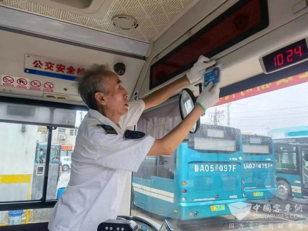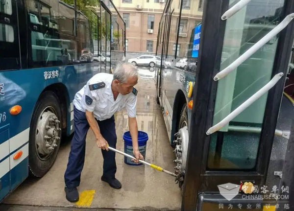 在工作岗位上的最后一天,孔繁顺像往常一样仔细擦拭着公交车