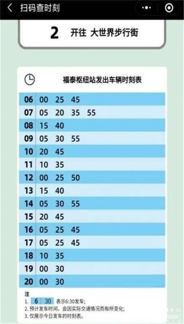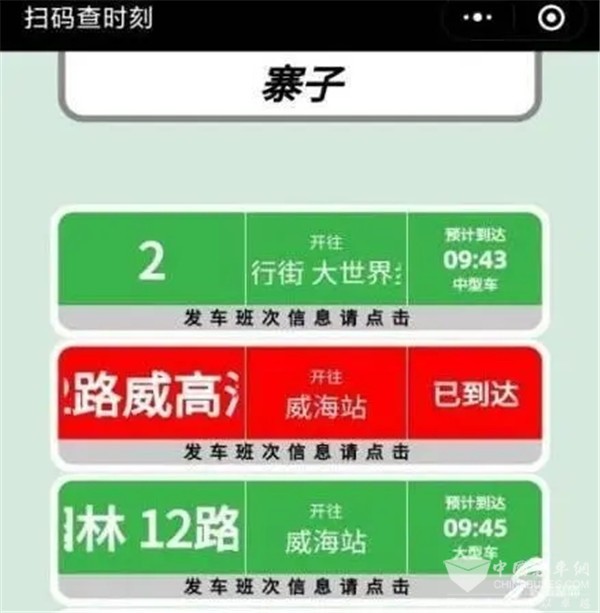 扫描站牌处二维码,页面显示途径该站点的线路、【绿色】代表“下班车预计到达时间”、【黄色】代表“该线路首站发车时间”、【红色】代表“车辆已到达该站点”、【灰色】代表“等待发车”,点击发车班次,页面便会跳转至该线路始发站的发车时刻表。