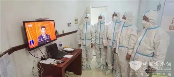 参与应急转运任务的驾驶员在工作间隙收看大会