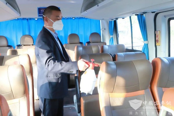 定制公司当班驾驶员提前1小时到达发车点,给车辆消毒。