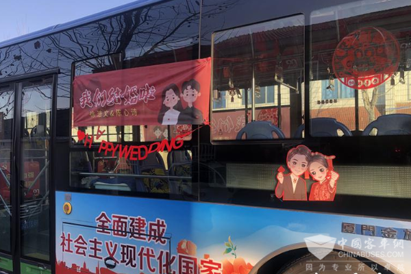 " 欢迎乘坐 20 路车,本车开往金玉良缘站。"2023年1 月 27 日上午,连云港徐圩新区东辛农场内,一辆喜庆、浪漫的公交车吸引了众多市民的目光。原来,这是一对 90 后小夫妻结婚用公交车接亲,简约又不失喜庆,个性十足。车头被装饰上了红色绣球,车厢内布置着红灯笼、红双喜,车身悬挂着 " 我们结婚啦 " 的横幅,分外显眼。