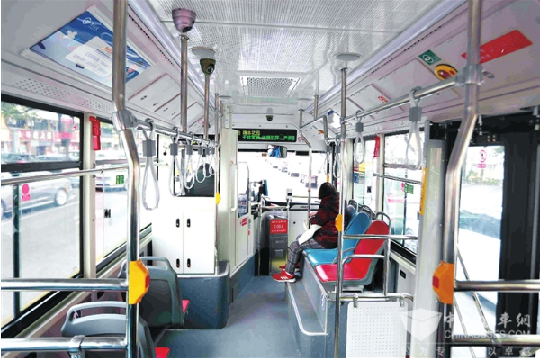 新上线的巴士不仅时尚美观,乘坐体验也极为舒适。公交车长约7米,以蔚蓝色为主调;车门踏板为一级踏板,上下车无需登台阶,对残障人士及行动不便者更为友好;车内配置座位14个,均为皮制海绵软座,每排座位旁配有两个3.6A的USB接口,可供乘客手机充电。车辆运行时安静平稳,即便上坡也没有噪音和顿挫感。