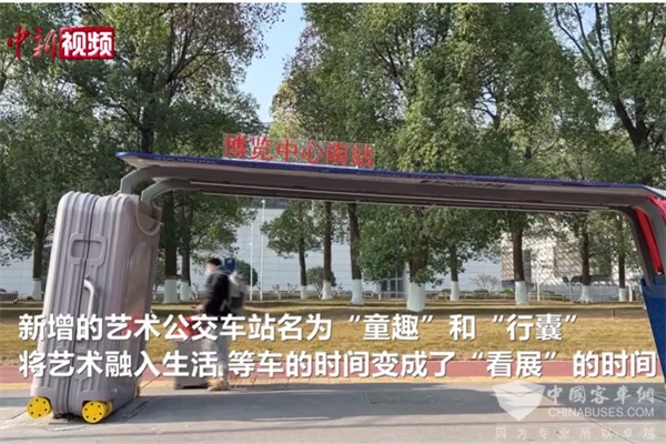 另一座“行囊”车站位于博览中心南站,一大一小两个行李箱的拉杆伸长弯曲,托住一张北京飞往重庆的登机牌形成顶棚。它们打破了传统公交车站的形态,将艺术融入生活,等车的时间变成了“看展”的时间,马路上的艺术展,让城市充满了魅力。