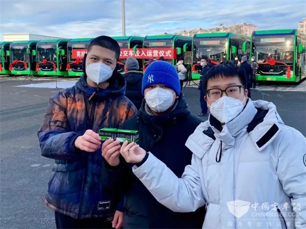 发车仪式当天,放寒假在家的大学生徐义凡和两名同伴带着公交车模型和条幅来到现场,庆祝首批纯电动公交车投入运营。