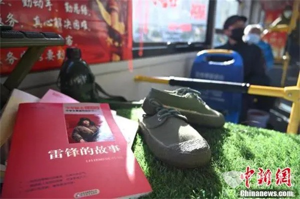 学雷锋”主题公交车内摆放雷锋精神书籍。