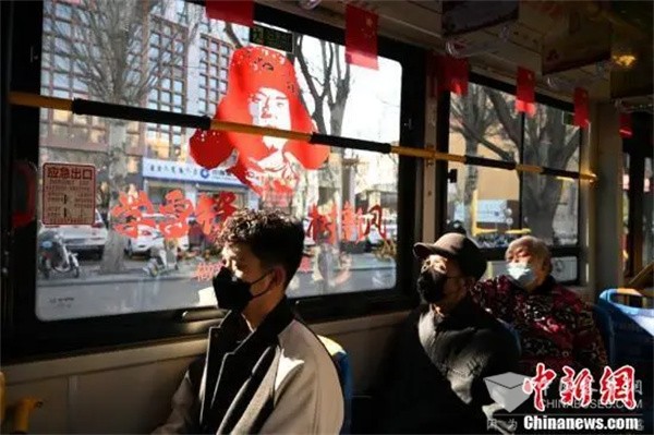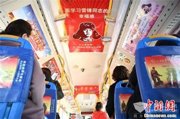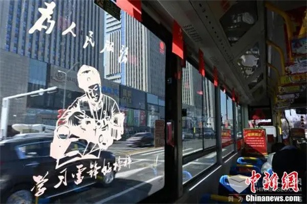 2023年3月2日,呼和浩特“学雷锋”主题公交亮相,车厢以“学习雷锋从我做起”“弘扬雷锋精神争当时代楷模”为主题词,内部布置雷锋画像,手把环、座位后背以“雷锋日记”“雷锋故事”等内容展示。同时,每位雷锋车组驾驶员都是志愿者,车厢内播放“学习雷锋好榜样”的音乐和宣传语,弘扬雷锋精神。图为内蒙古呼和浩特市,“学雷锋”主题公交车车顶布置有雷锋画像。