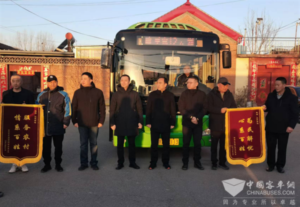 发车仪式现场,村民代表将印有“为民解忧 心系百姓”“服务农村 情系百姓”两面锦旗送到密云宝成客运公司相关负责人手上,村民们载歌载舞庆祝公交进村。