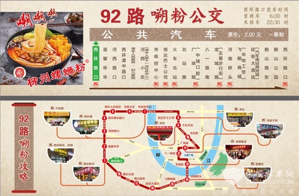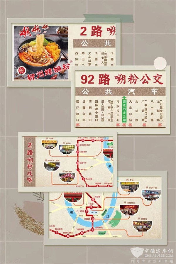 目前,柳州恒达巴士公司已经完成设计并制作“螺蛳粉公交专线”、“嗍粉公交线路”车辆螺蛳粉广告元素,重新设计制作2路、92路的线路牌样式,突出螺蛳粉元素,标明沿线网红螺蛳粉店的名称。同时在柳州火车站和龙城路公交站台,设置线路走向图,便于乘客了解沿线螺蛳粉店的分布点,方便“嗍粉”客人选择下车站点。根据全市网红螺蛳粉店的地理分布,编制“嗍粉”公交攻略,同步与2路和92路一并进行对外宣传。同时,结合支付宝新人免费乘车活动,联动“支付宝”平台“嗍粉公交”沿线合作商家投放满减优惠券,吸引商家顾客搭乘公交出行。