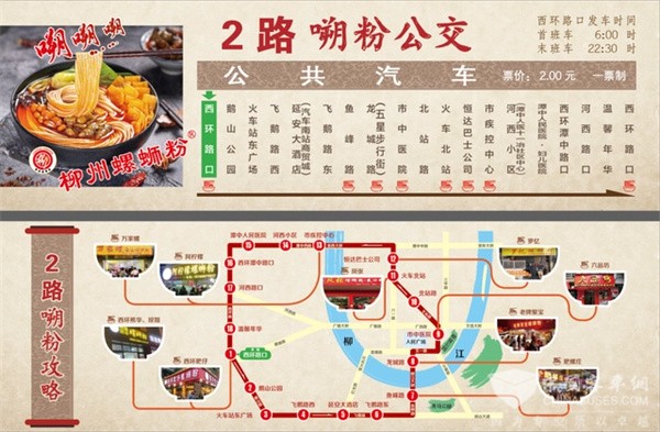 两条螺蛳粉“嗍粉公交线路”的运营时间均为早上6时至晚上10时30分,票价2元。