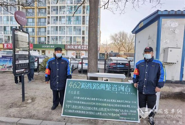 2023年3月15日线路调整当天,记者来到新增设的北京人家北门站看到,附近多位居民正在等候公交车。462路车队工作人员在站台为居民宣传讲解线路调整后的途经站点。