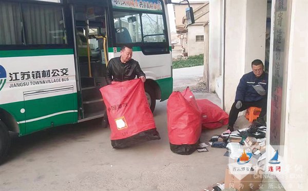 2023年3月15日下午3时,在一辆发往灌南-堆沟班线的交邮公交车专线上各项服务设施摆放整齐,与其他普通公交公司不同的是,在专线车辆的后面两排,一些快递包裹被整齐堆放着并用围栏挡起来。当班的公交驾驶员黄师傅充当“快递员”,帮着邮递员装车、清点货物,然后签字、上锁,最后由投递员将快递包裹完好无损地交到村民手中。