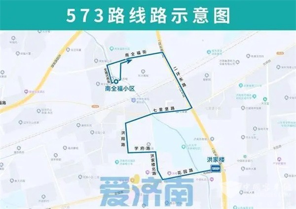 为方便洪家楼片区、南全福片区居民出行,填补洪翔路、学府路、南全福街等部分路段公交空白,加强沿线片区与地铁2号线的联系,济南公交自2023年3月23日起,开通试运行573路。