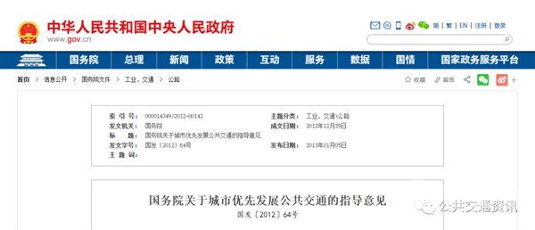 在国发〔2012〕64号 《国务院关于城市优先发展公共交通的指导意见》文件中,明确提出了我国“实施城市公共交通优先发展战略”的优先发展理念、科学发展原则,建立持续发展机制等。强调“突出城市公共交通的公益属性,将公共交通发展放在城市交通发展的首要位置,着力提升城市公共交通保障水平。在规划布局、设施建设、技术装备、运营服务等方面,明确公共交通发展目标,落实保障措施,创新体制机制,形成城市公共交通优先发展的新格局。