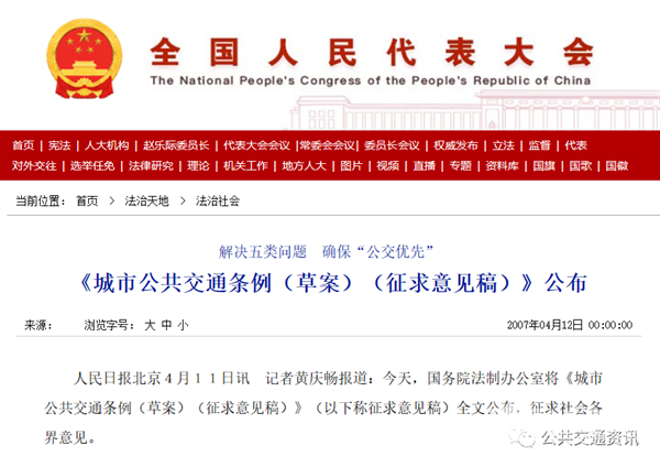 二、“公交优先”的立法一直走在“尽快出台”之路上当然,仅仅解燃眉之急不是长远之计。国家惟有立法,才能从根本上解决公交时时被钱所困的痛感!今年的全国两会上,参会的公交人大代表又多次呼吁条例尽快出台!其实,改革开放四十年,“公交优先”立法工作一直在进行中,且在加快步伐。近10多年来,国家主管部门曾先后三次将《城市公共交通条例》向社会公众公开征求意见,为增强立法的公开性和透明度,提高立法质量。