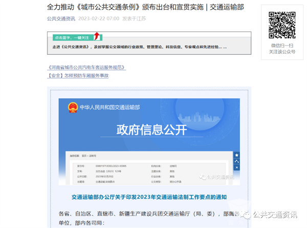 ★ 2023年2月2日,交通运输部办公厅印发了《关于2023年交通运输法制工作要点的通知》,该通知第二条“健全完善综合交通法规体系”中的第(二)点“推进行业重点法律法规立法进程”,排在第一位的就是“全力推动《城市公共交通条例》颁布出台和宣贯实施”。
