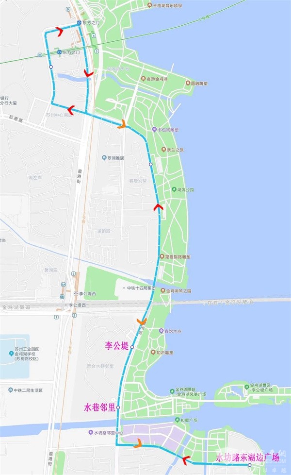 公交示范应用线路位于星州街与水坊路之间,贯穿东方之门、苏州中心、李公堤等重要商业体。