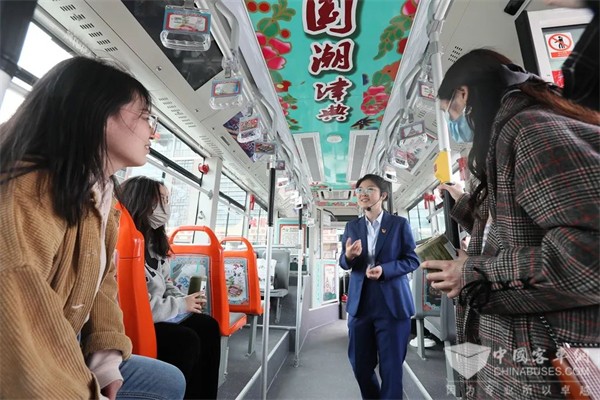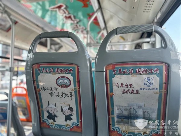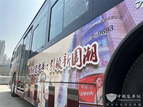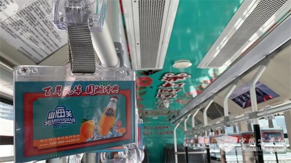 登上主题车,车内以红色和绿色的国潮元素为主色调,车顶上“百年风华 国潮津典”八个大字在花团锦簇中格外醒目。据主题车设计者天津市公交文化传媒发展有限公司崔梦桥介绍:“车顶的花纹使用了‘万紫千红’包装上的经典纹样,清新的白玉兰花香是很多人儿时的记忆,与‘百年风华 国潮津典’的主题非常契合。”为了更好的展现产品,主题车设计中,还为每一个产品都单独制作了产品宣传图,在车内灯箱、拉手、座椅背板等位置进行展示。