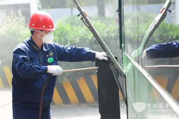 “你看,这就是公交车的‘肺部’,只有这里干净了,车内的空调出风才能清新流畅。”王勃给记者指着车顶的部位,动作娴熟的打开一块盖板,小心翼翼的卸下空调蒸发器的滤网,递给接应的同事进行清洗。随后,他又熟练地打开车顶天窗,并套好安全绳,爬到3米多高的车顶。站在车顶,王勃手持高压水枪仔细清洗蒸发器。待车下另一名同事将过滤网用水枪认真冲洗消毒后,他再重新安装到位,这样一套“行云流水”的动作做完,为一辆公交车“洗肺”的流程就接近尾声了。