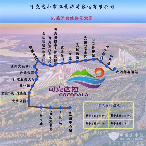 优化改造后的六十八团至伊宁市的68路公交车,按照“运游融合、景城融合”的发展思路,途经可克达拉、六十六团,乘客可以沿途欣赏可克达拉生态之城的自然风光。