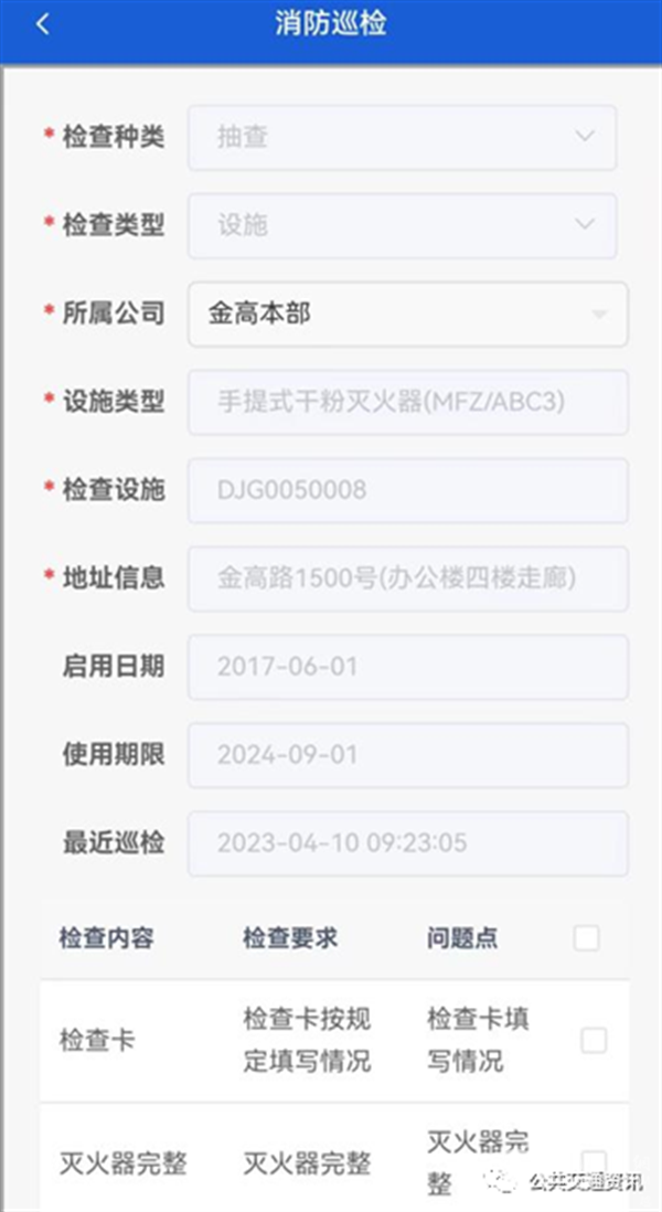 金高公交通过制订《消防设施管理办法》、突发火灭应急预案、日常消防安全知识培训及实操演练等方式对相关法律法规进行细化、延伸,构建了较为科学、完整的企业消防安全管理体系,为企业消防安全管理规范化、标准化提供制度支撑,打牢管理基石。同时,采用现代信息化手段订制了“消防安全管理系统”,实现手机APP“管理通”扫二维码,进行每月常规检查、抽查监管、设施信息汇总及报修整改等消防隐患预防措施,运用科技手段实现消防安全管理标准化。