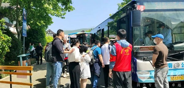 第四客运公司34路志愿者在中山陵停车场引导乘客有序乘车。为应对“五一”节期大客流,在增加运力投放的基础上,开通中山陵停车场至下马坊地铁站的区间运营线路,快速接驳分散客流,确保市民和游客的安全有序乘车。