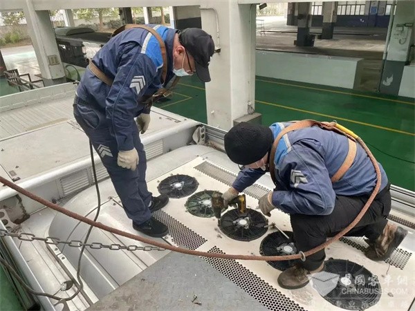 在固定场地,维修人员采用高压水枪冲洗和消毒液喷洒相结合的方式,对滤网、蒸发器等部位进行清洗,并打开各个风道进行消毒,检查维护控制面板、电路线路等,全力确保车辆空调性能良好。