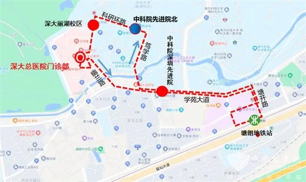 桃源街道位于南山区十大重点片区之一的西丽湖国际科教城核心区域,辖区内高等院校、科研院校、企业园区众多,新增人口逐年提升,交通压力持续增大。深圳大学总医院位于留仙大道北侧,距最近的塘朗地铁站约2.2公里左右,市民乘坐公共交通前往医院就医不便。