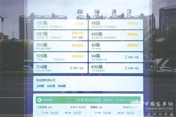 公交候车亭上,电子大屏幕实时显示公交信息,让市民及时掌握车辆行驶信息。