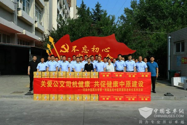 河南中医药大学第一附属医院向公交驾驶员进行爱心捐赠,集团公司工会向驾驶员发放爱心水杯。