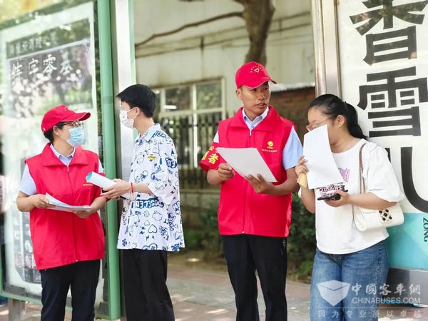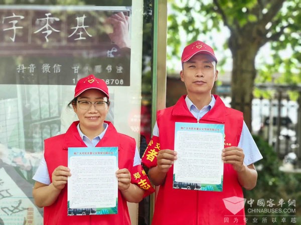 会场外,郑州公交集团党团员、青年志愿者在市内各大公交站点宣传、发放《致广大人民关爱公交驾驶员倡议书》,同步开展志愿服务活动。