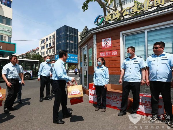 5月19日上午,威海公交集团党委书记、董事长曲波,党委副书记、工会主席王亚丽前往实验中学及威高广场枢纽站,看望慰问一线驾驶员并送上慰问品。