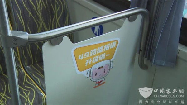 为了更好完善新的服务举措,49路车厢的语音播报进行了全面升级,49路驾驶员徐俊做了充足的前期准备工作,他利用休息时间,细致地将每一个站可换乘的轨道交通信息进行了整理,并将安全提醒的内容一起融入车厢语音播报中。此外,49路上下车门和扶手处都张贴着“49路为您等待”和“车辆停稳再起身哟”等字样,为乘客提供一份安全乘车暖心提醒。