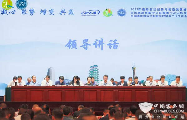 2023年道路客运创新与转型发展峰会暨全国旅游集散中心联盟第六次工作会议、全国道路客运定制服务联盟第二次工作会议于9月6日在河南郑州隆重召开。中国道路运输协会会长王丽梅、交通运输部运输服务司司长蔡团结、文化和旅游部市场管理司二级巡视员邹端、河南省交通运输厅二级巡视员崔梅、文化和旅游部产业发展司产业促进处副处长胡荫渊、交通运输部运输服务司客运管理处处长何明等领导莅临会议。中国道路运输协会副会长、全国旅游集散中心联盟理事长、苏汽集团有限公司董事长单建华,中国道路运输协会副会长、全国道路客运定制服务联盟理事长、新国线运输集团有限公司董事长王旭,中国道路运输协会副会长、郑州宇通集团有限公司董事长汤玉祥,中国道路运输协会秘书长张光合,郑州交通运输集团有限责任公司董事长王振宾,《中国道路运输》杂志社社长兼协会副秘书长刘云军、中国道路运输协会副秘书长郭平,以及全国旅游集散中心联盟和全国道路客运定制服务联盟两大联盟的副理事长王均国、郭俊发、唐玉才、谢星、卓彬、闻明、马凤萍、安鹏、黄明生、梁智、王晓、赵启胜等领导出席会议。另有来自全国各地主管部门、道路客运企业、相关科技企业、汽车制造企业、以及各省协会代表近600人齐聚一堂,共谋转型路、共绘新蓝图。大会分别由王旭、郭俊发、黄明生、闻明主持。