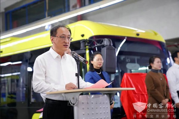 袁杏娣在致辞中感谢了常州市交通运输局、北汽福田欧辉客车等各级单位对常州公交长期的支持和关心,向参与装配制造的全体职工表示诚挚地敬意。指出常州公交下一步将以此次首辆新能源客车下线为新起点,厚积薄发,行稳致远,全力保障首批75辆新能源客车装配生产。同时要以质量满分实现用户满意,以学习不停实现创新不断,以顶格力度干出满格速度。扎实推进有序生产、安全生产、批量生产,加快产能爬坡,确保车辆早交付、早使用。