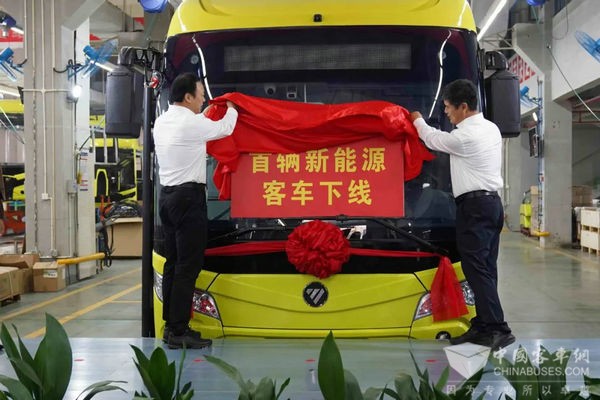 仪式最后薛晔与韩冬一起为“首辆新能源客车下线”揭牌,开启了常州公交新能源客车智造篇章。
