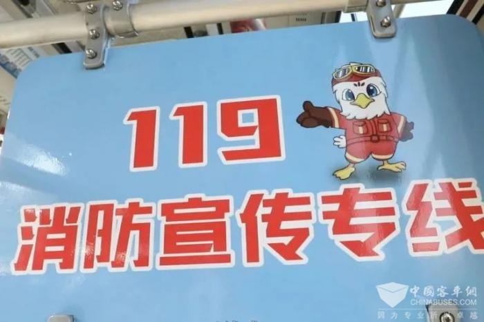 “乘119路车,做消防安全人”。在车身两侧张贴的消防安全标语简单易懂、贴近群众生活,车内原创的消防文创人物生动活泼,看板、挂牌、靠背、灰板、驾驶员挡板等部位不仅设置了醒目的消防主题元素、提示性宣传标语和消防成语故事,还设置了防火常识、正确拨打119火警电话、疏散逃生等一系列消防安全知识。坐在车上,犹如进入了一个移动的小型消防安全科普教育馆,乘客举手投足间就能便捷地获取掌握消防知识。