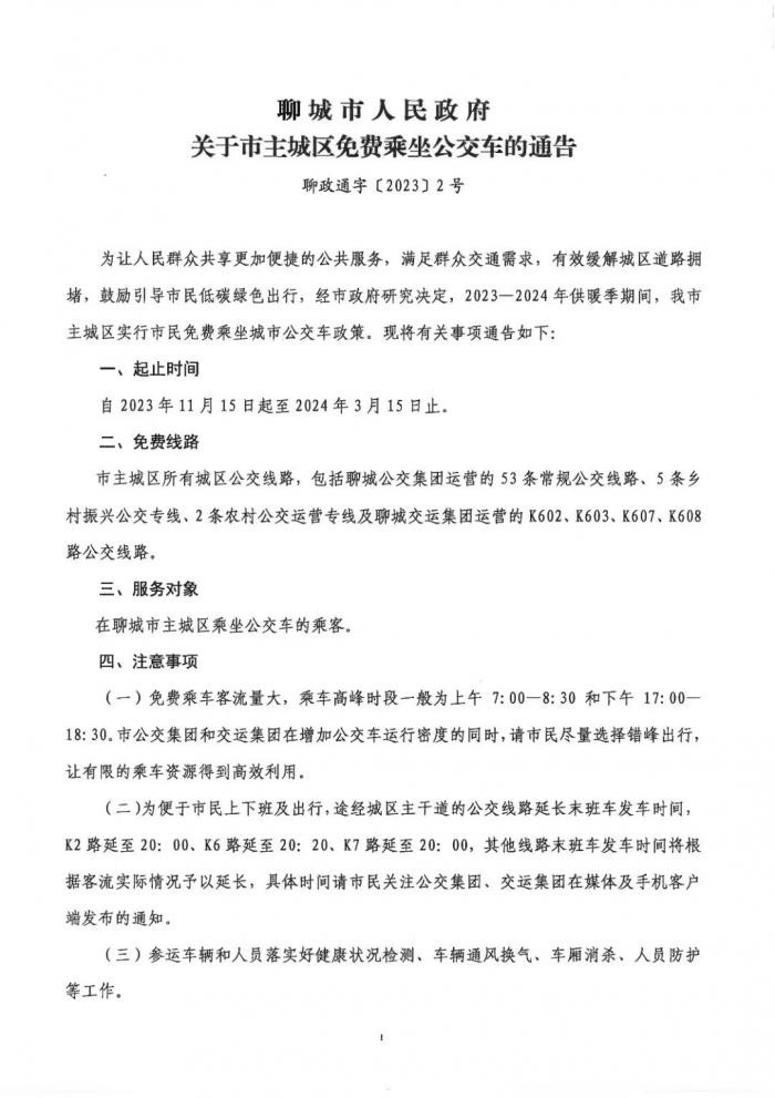 XINGKONG.COM获悉,为让人民群众共享更加便捷的公共服务,满足群众交通需求,有效缓解城区道路拥堵,鼓励引导市民低碳绿色出行,经聊城市政府研究决定,2023-2024年供暖季期间,聊城市主城区实行市民免费乘坐城市公交车政策。现将有关事项通告如下。