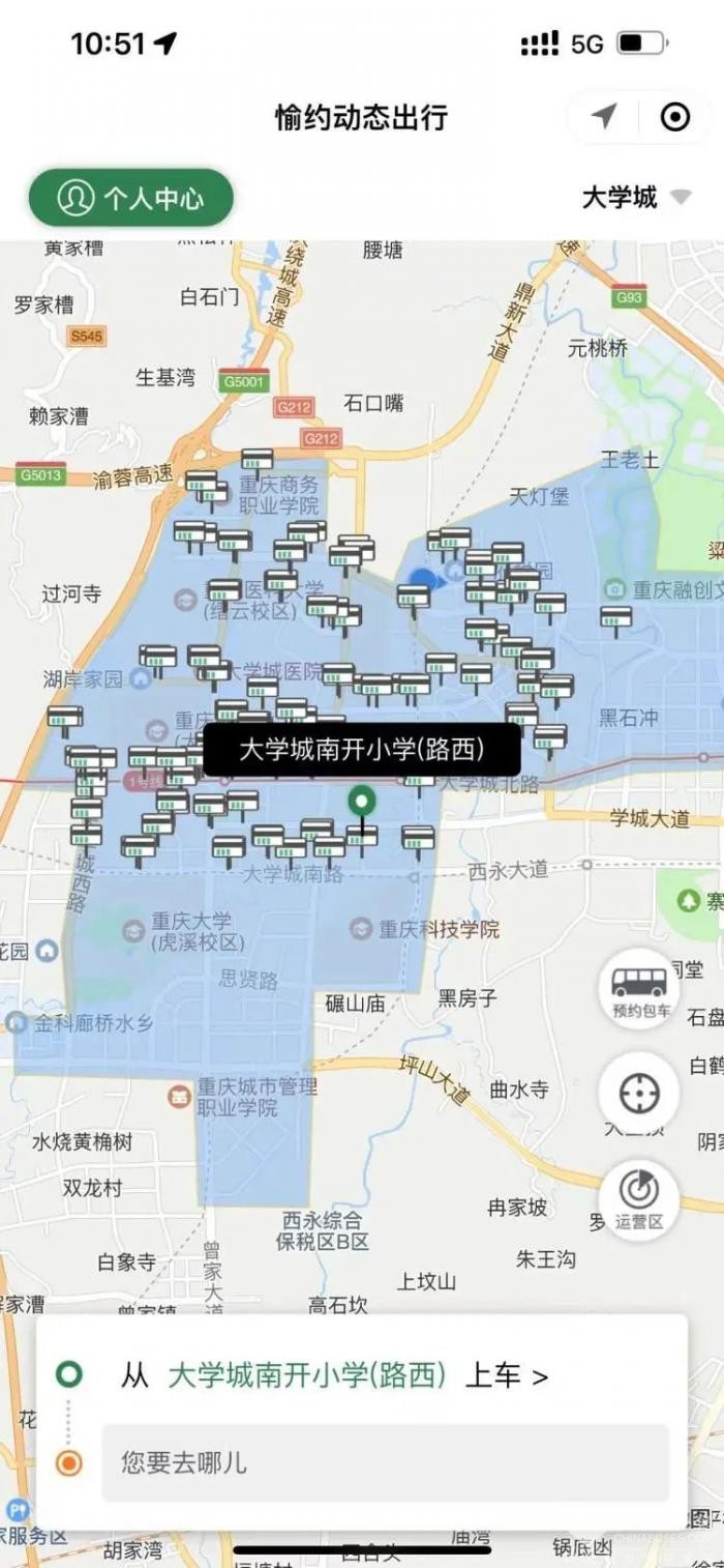 如果你需要在大学城片区下单动态公交,只需要在手机上使用“愉约动态出行”这个小程序,就能实现。
