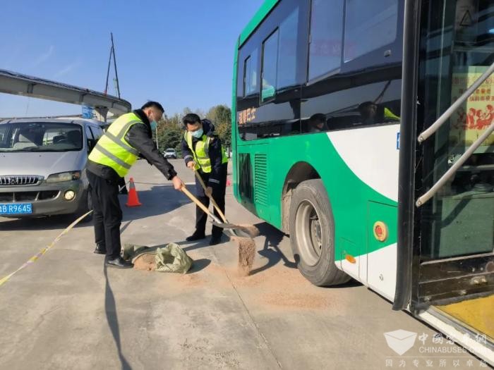 几分钟后,120医护人员、通达分公司应急小组成员相继赶到现场,医护人员将伤者搀扶到救护车上先行送往医院,分公司应急小组成员则将车内其他乘客疏散到提前调配到现场的605路应急车辆上,继续将乘客运送到目的地。同时,应急人员还在车辆周边抛撒防滑沙,给车辆后轮胎挂装防滑链条,确保该车处于安全状态。