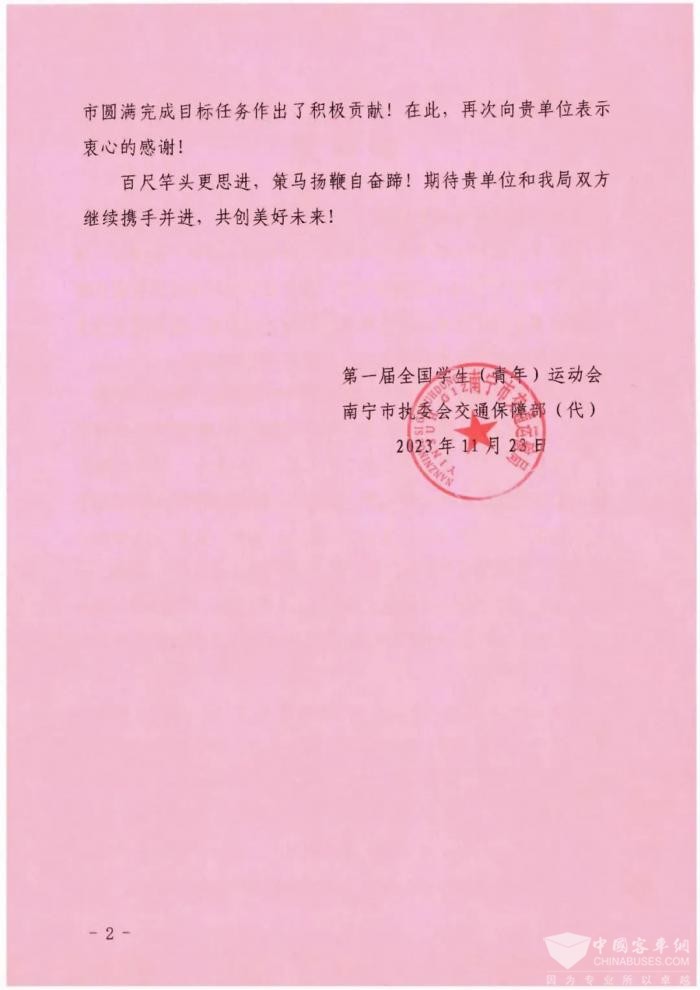 确保各项交通保障工作顺利完成 南宁白马公交喜获学青会感谢信