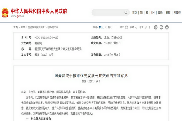 为进一步确立优先发展城市公共交通的战略地位,国务院于2013年1月5日印发了《国务院关于城市优先发展公共交通的指导意见》【国发〔2012〕64号】,正式将优先发展城市公共交通提升为国家发展战略。