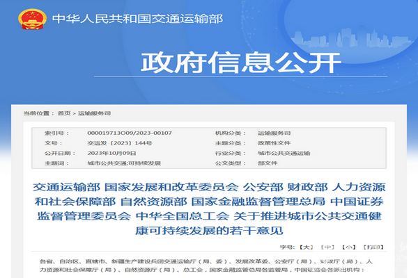 为推进城市公共交通健康可持续发展,2023年10月8日,国家交通运输部会同国家发展和改革委员会、公安部、财政部、人力资源和社会保障部、自然资源部、国家金融监督管理总局、中国证券监督管理委员会、中华全国总工会等共9部委印发了《关于推进城市公共交通健康可持续发展的若干意见》【交运发〔2023〕144号】,提出了完善城市公共交通支持政策、夯实城市公共交通发展基础、加快落实城市公共交通用地综合开发政策、加强从业人员权益保障、加强组织实施保障五方面共15项政策举措。(以下简称《意见》)