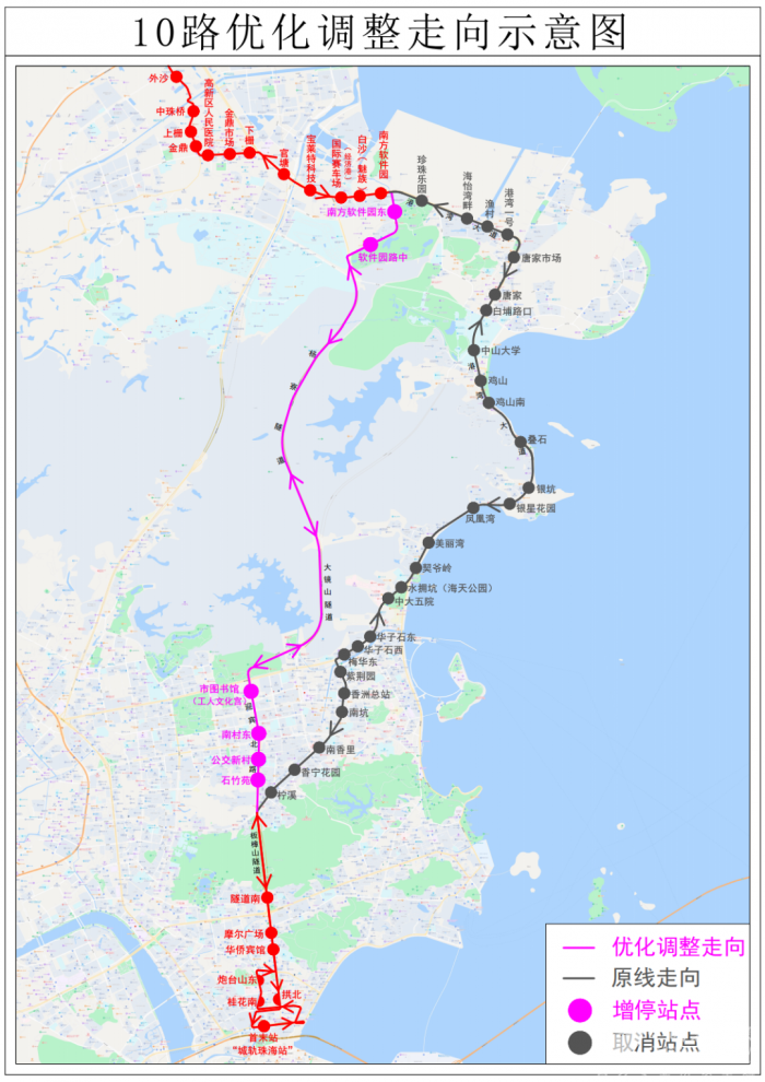 调整说明:线路双向改经软件园路、兴业快线、迎宾路运行,不再绕行唐家、香洲、柠溪等区域。