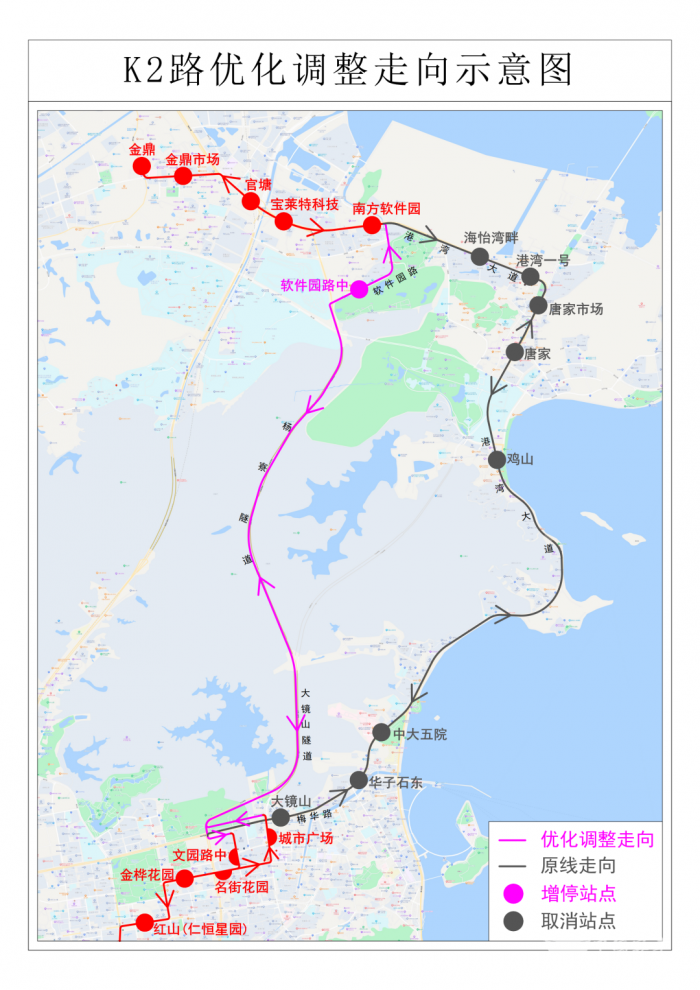 调整后,原取消站点乘客可改乘18、68路等替代线路出行往返;或通过“红山(仁恒星园)”、“金桦花园”、“城市广场”等站点换乘K2路。