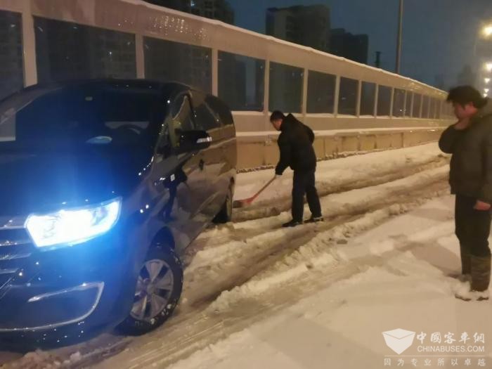 凌晨3点多,目测道路上的积雪已经有10厘米那么深。为确保雪天公交行车安全,保障市民出行。由20名党员驾驶员组建“党员志愿服务队”,分成两队,一队为“探路先锋”,一队为“破冰队”。凌晨4点,他们分别前往西三环航海路立交桥、西四环航海路附近的立交桥等地,实地勘察路况,掌握道路通行信息,针对陡坡、桥梁、调头口等,容易打滑、安全隐患较大的路面,开展除雪、破冰、撒盐、保畅工作,为公交车及社会车辆的安全出行保驾护航。