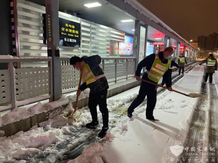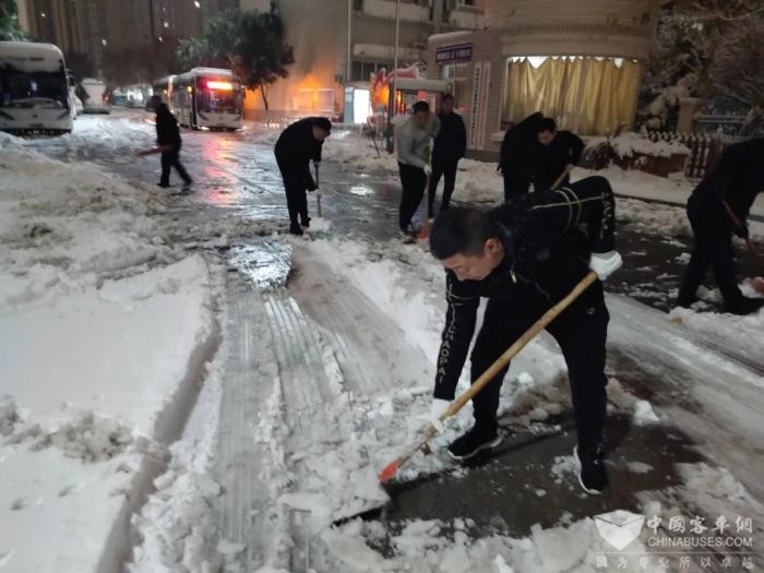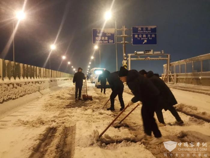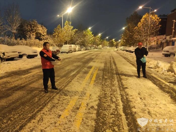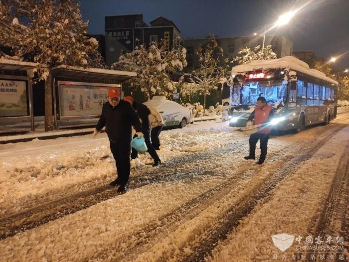“现在是凌晨4:30,我们早班车的公交驾驶员已按计划提前到岗,大家分工协作,有的预热车辆,有的展开除雪工作,全力保障首班车顺利发出……”12月11日凌晨,在位于郑州市管城区的石化路公交站院内,来自郑州公交B15路的驾驶员张伟锋一边打开车辆电源,一边对公交车辆进行预热,早早的做好了发车前的各项准备工作。而在另一边,由运营一线公交驾驶员组成的“应急小分队”已集结完毕。大家严格按照郑州公交“恶劣天气应急预案”的相关要求明确责任分工,携带融雪剂、除雪铲等除雪装备,奔赴所属线路的各个积雪结冰路段,有序展开除雪融冰工作。
