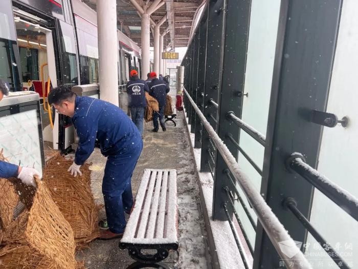 现代电车公司扫雪突击队在各大站台,铺上草垫防滑,清除积雪,保证乘客出行安全。