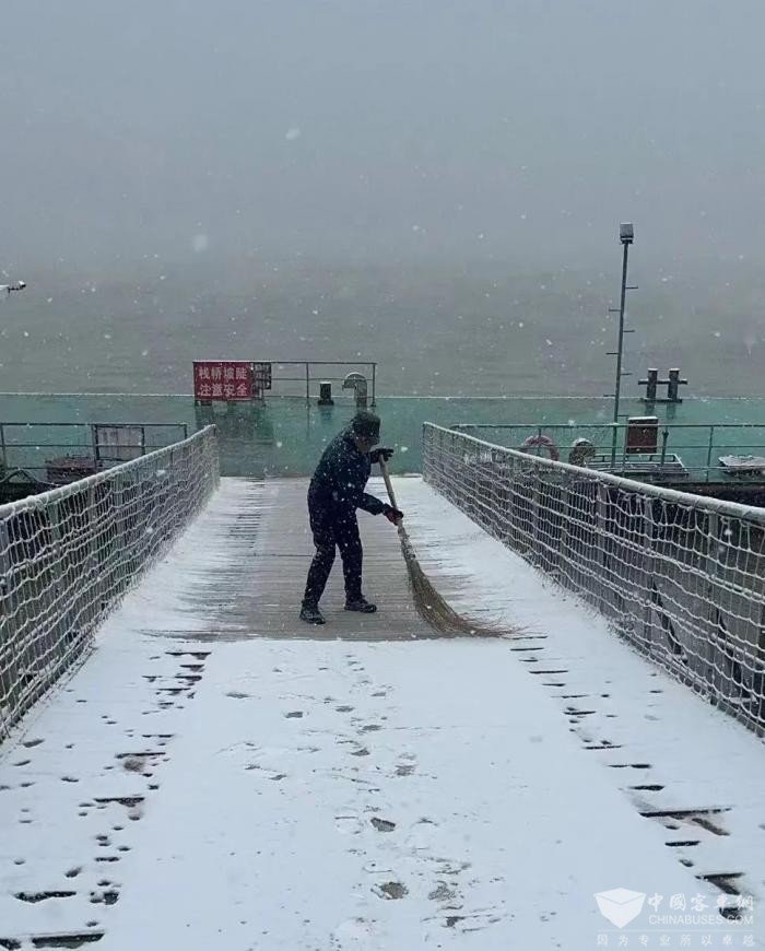 轮渡公司按照应对暴风雪应急预案部署,组织员工用地推、扫帚等对栈桥、下客通道等处的积雪进行清除,并在门口、栈桥连接处铺设草垫,消除安全隐患。