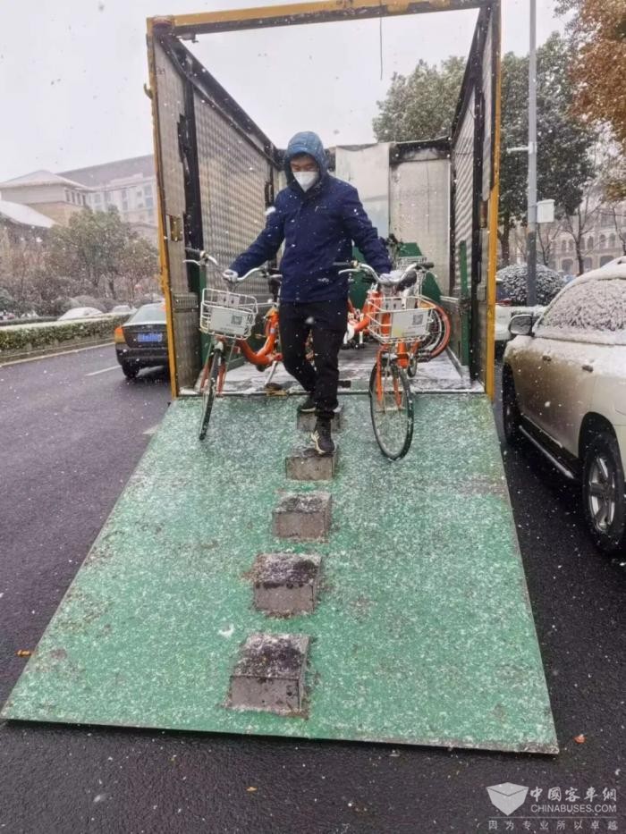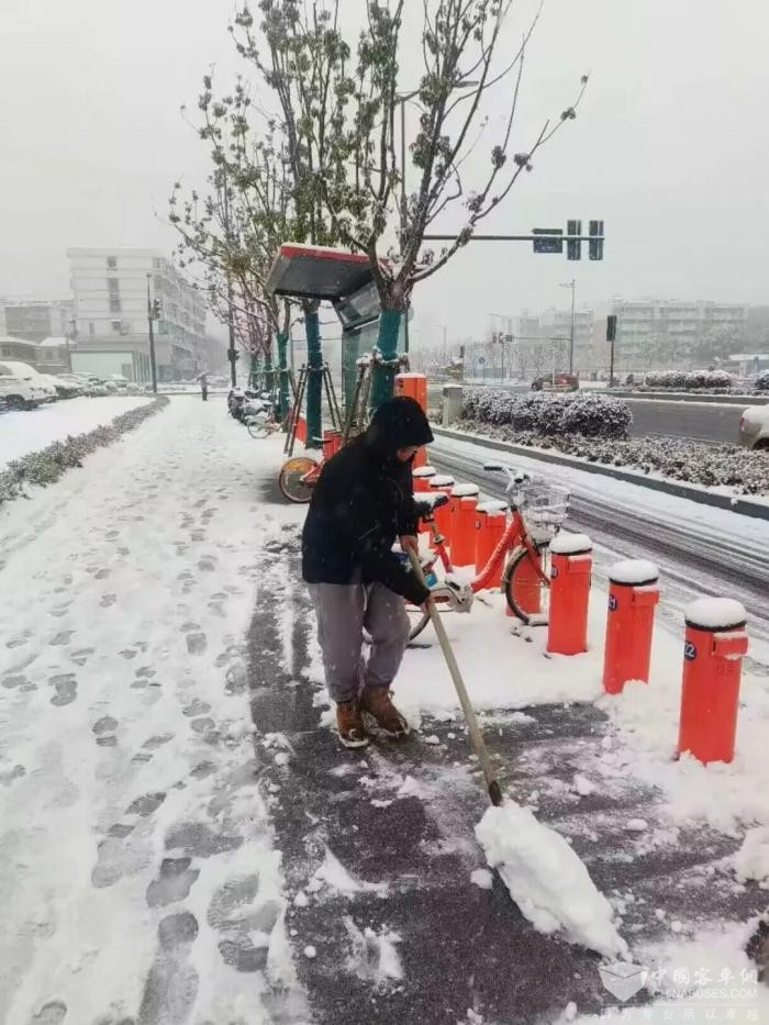 公共自行车公司安排工作人员到各个站点清除积雪,并对车桩、站点机柜进行维修保供。